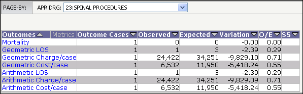 On this analysis, each row is an outcome: Mortality, Cost, Charge, LOS, etc. The following metrics return for each outcome when the grid returns: