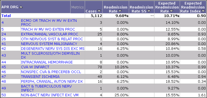 This analysis retrieves readmissions regardless of APR DRG. Use this analysis to determine how well your facility performs compared to the normative values in the Perspective Database. This analysis quickly compares your facility's severity-of-illness-adjusted readmission rate to the expected readmission rate in Perspective Database. You can compare overall performance and performance across all disease categories, such as APR DRGs or APR DRG Business Lines. You can quickly locate any disease categories that are performing better or worse than the expected value by analyzing the index measure.