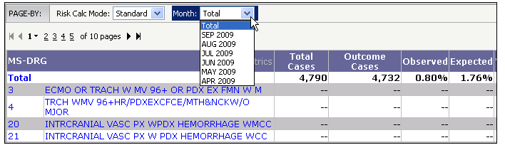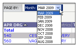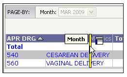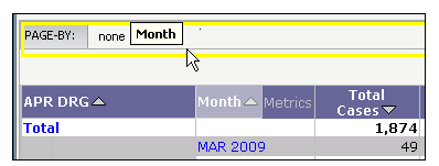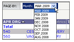 In the example below, APR DRG and Month attributes were selected as Row Headers and Month was moved to the Page-By. Therefore, only the data for March 2009 displays in the grid. If you selected FEB 2009, only the data for February 2009 would display in the grid and so on for each item in the dropdown list.