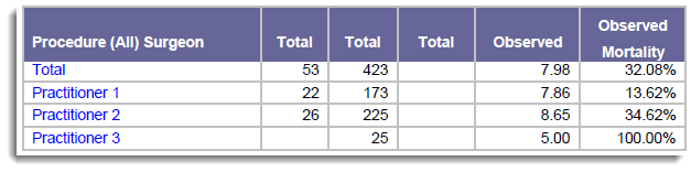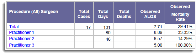 The Total Cases metric for Practitioner 1 reflects the number of individual patients Practitioner 1 treated, the Total Days, Total Deaths, Observed LOS, and Observed Mortality Rate metrics for Practitioner 1 have changed as well.