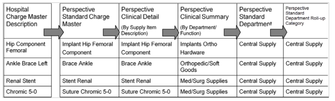 Mapping philosophy refers to the manner in which elements in one reporting level are grouped into a singular category in the next higher reporting level. Premier’s SPL provides four Comparative Reporting Levels (Hierarchies). The first level, the Perspective Standard Department, represents a hospital’s most common cost centers. The examples in this section illustrate the mapping philosophy in detail.