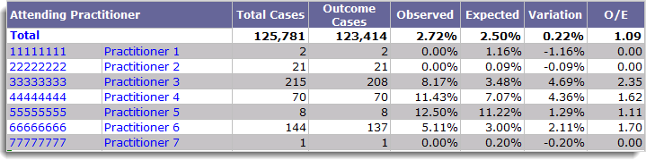 On risk-adjusted analyses, the Observed, Expected, Variation, O/E, and Statistical Significance values are based on the Outcome Cases not the Total Cases.