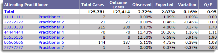 The following graphics show a Mortality Comparison with Attending Practitioner placed on the rows for the same facility for the same timeframe in the 3M™ version and then the CareScience Analytics version. Note that the number of Total