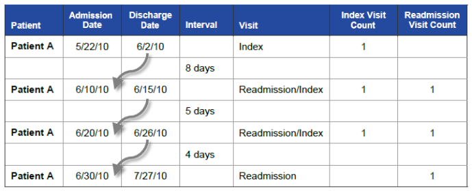 - The data is based on the readmission visits included in the analysis. In the example above, only the last three patient visits would be included in the patient population for the analysis, because they occur within the selected “Readmission Days” of the discharge dates for the corresponding index admissions.