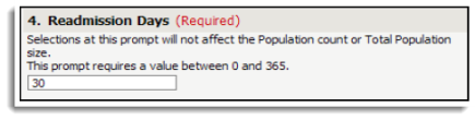 - Interval: You define the interval at the Readmission Days prompt (0–365 days can be selected). 30 days is the default.
