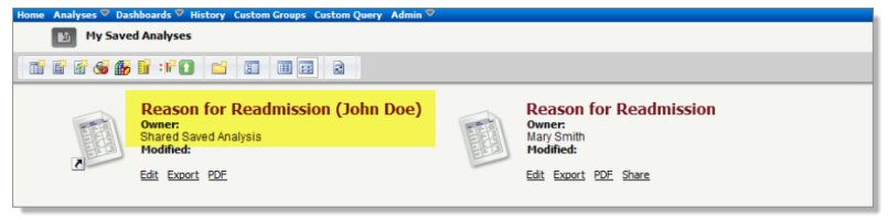 Analyses that have been shared with you will appear in your My Saved Analyses with the name of the person who shared the report with you. In the illustration, the analysis on the left has been shared by John Doe: