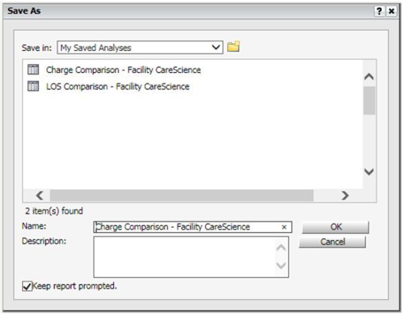 Static - Only the saved analysis can be retrieved from My Saved Analyses. The analysis cannot be re-prompted. Additionally, if an analysis is saved as Static, it cannot be resaved as Prompted. - Click Save.The analysis is then saved to the designated location.