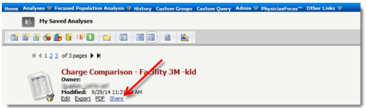 - To share an analysis that was shared with you, you must first save it to My Saved Analyses. Once you have saved the report, the Share link will display for the analysis.