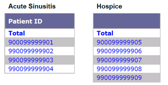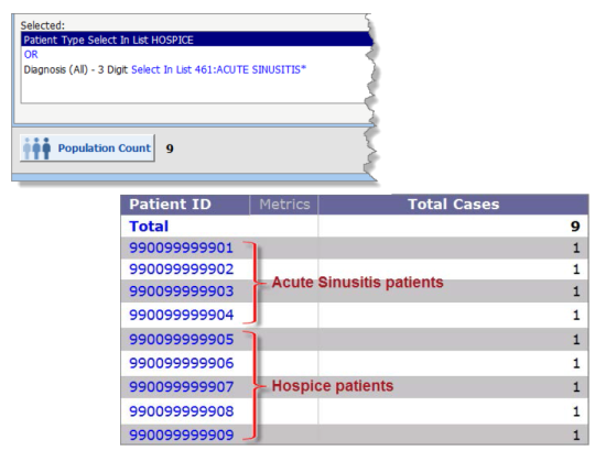 Note: If, for example, Patient 990099999909 had both a patient type of Hospice and a diagnosis of Acute Sinusitis, then the population count would be 8, because this patient would meet both criteria and only be counted once.