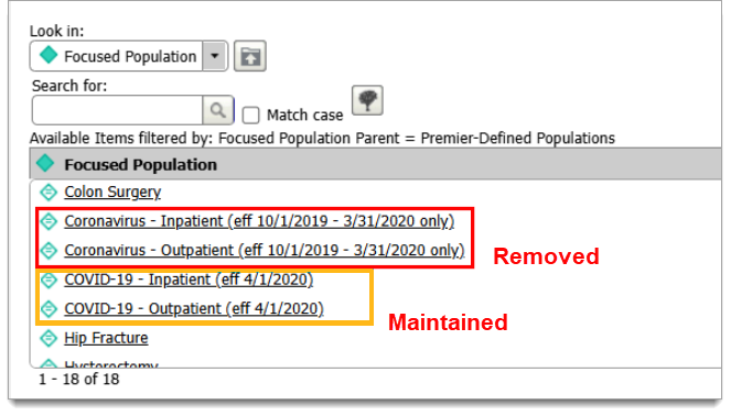 Since data through 9/30/2020 was archived from QualityAdvisor with the recent July 2025 release, the Focused Population attributes for IP and OP Coronavirus are now removed: