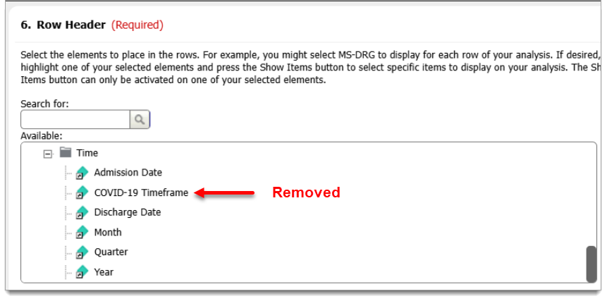 With 2020 data being archived through 9/30, this separation of data on reports is no longer valid. Therefore the COVID-19 Timeframe attribute is removed from the Row Header prompt, the Column Groupings prompt, and from patient drill options.