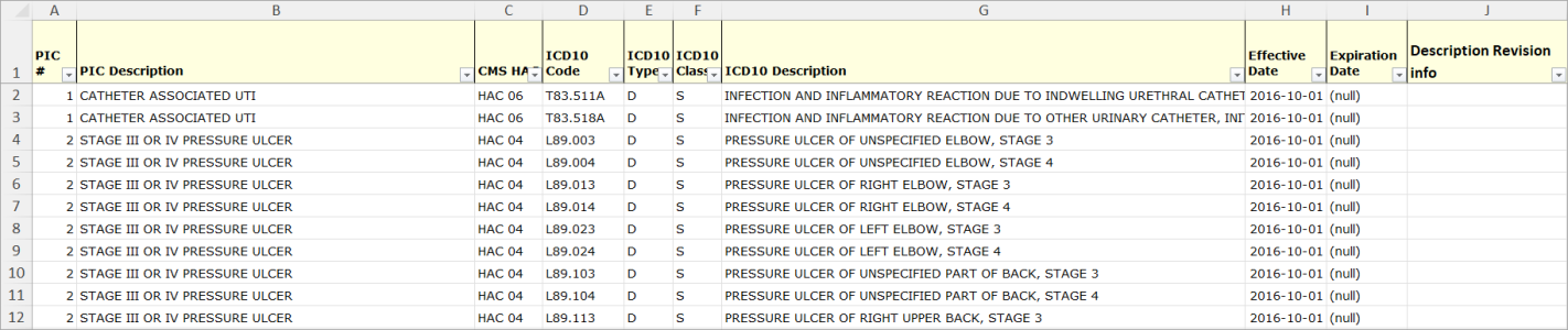The new CMS HAC and PIC List document allows you to see the masters list of Potential Inpatient Complications, including whether it is a CMS HAC or not, the ICD-10 code (including Types and Classes), the Effective Dates, and the Expiration Dates.