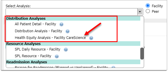 Report details and sample screens are available to review by selecting either Health Equity Analysis – Facility CareScience or Health Equity Analysis - Peer CareScience.