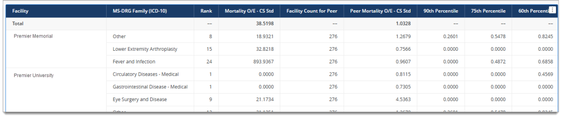 We have selected key CareScience risk-adjusted outcomes and PSI's (listed below) to include in the dashboard. You will see the O/E performance breakdown for each outcome across the 90th to the 10th percentiles for each facility you select, against peer O/E performance.