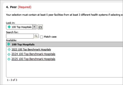 The 100 Top Hospital Peer Group option was added to QualityAdvisor in April 2024. At that time, the only peer list available was the 2023 Top Hospital winners. With this July 2025 release, we are adding both the 2024 and 2025 Top Hospital winners as separate peer groups. You will now see all three peer group options in the Premier Initiatives parent folder.
