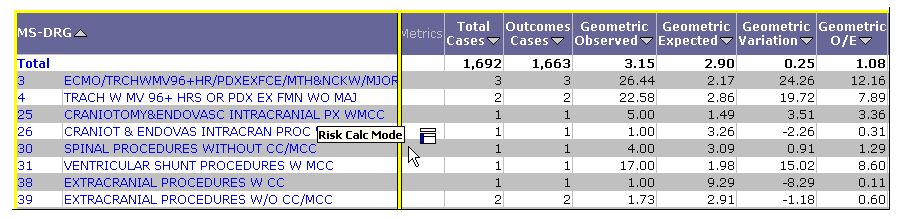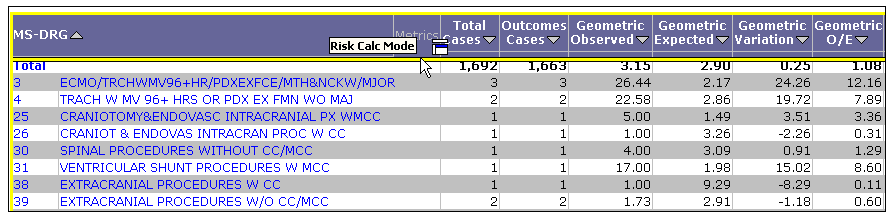 - Run a CareScience Analytics analysis. The grid returns displaying Select values and the Risk Calc Mode Page-By.