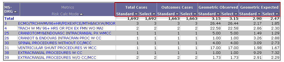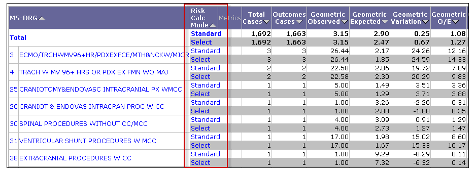 By default, most CareScience Analytics analyses return displaying Standard values. Above the grid, the Page-By contains the Risk Calc Mode dropdown list. Use this list to toggle between Expected valuesfor Standard and Select Practices on grids.