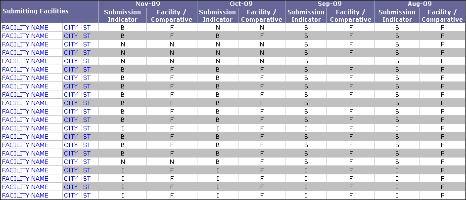 This report is a downloadable Excel spreadsheet that runs automatically when you click Analyses > Facility Submission Status. It shows which data is available for reporting for all facilities that publish data to QualityAdvisor, including yours.