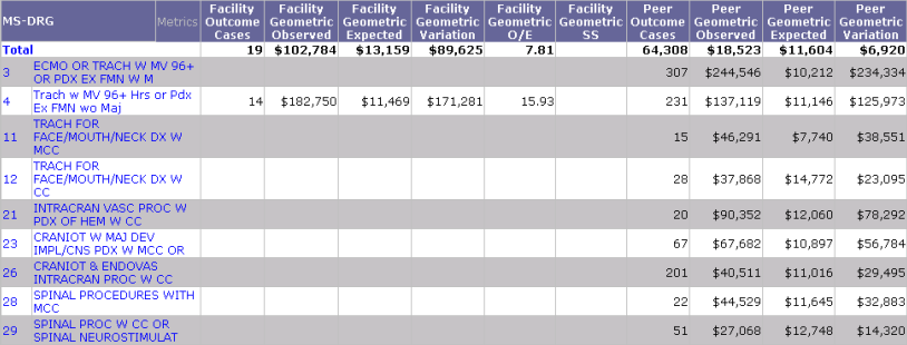 - Peer Geometric Expected - The expected value for the Outcome Cases, calculated using the CareScience Analytics risk-adjustment methodology and the geometric mean.