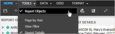 Click on Tools in the report toolbar and then select Report Objects.