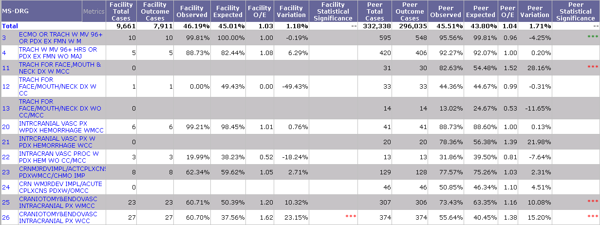 - Facility SS - Asterisks display only if the Variation is statistically significant. The number of asterisks indicates the confidence level that the outcome's variation is not due to chance: 1 asterisk = 75%, 2 asterisks = 95%, 3 asterisks = 99%. Green asterisks = the outcome’s variance is statistically better than expected. Red asterisks = the outcome’s variance is statistically worse than expected. Total lines do not have values for Statistical Significance.