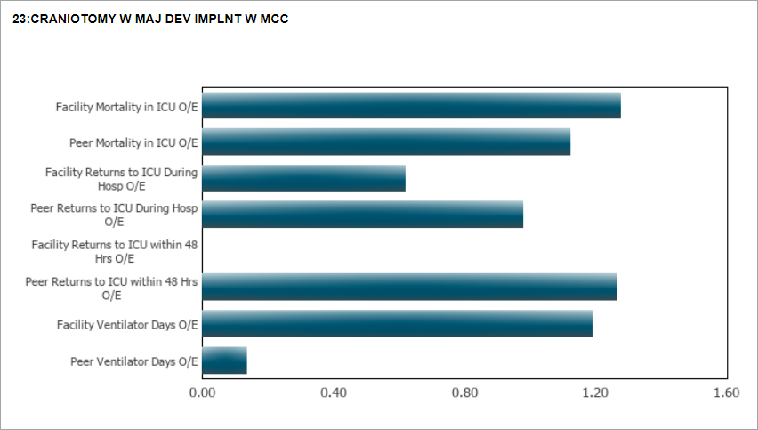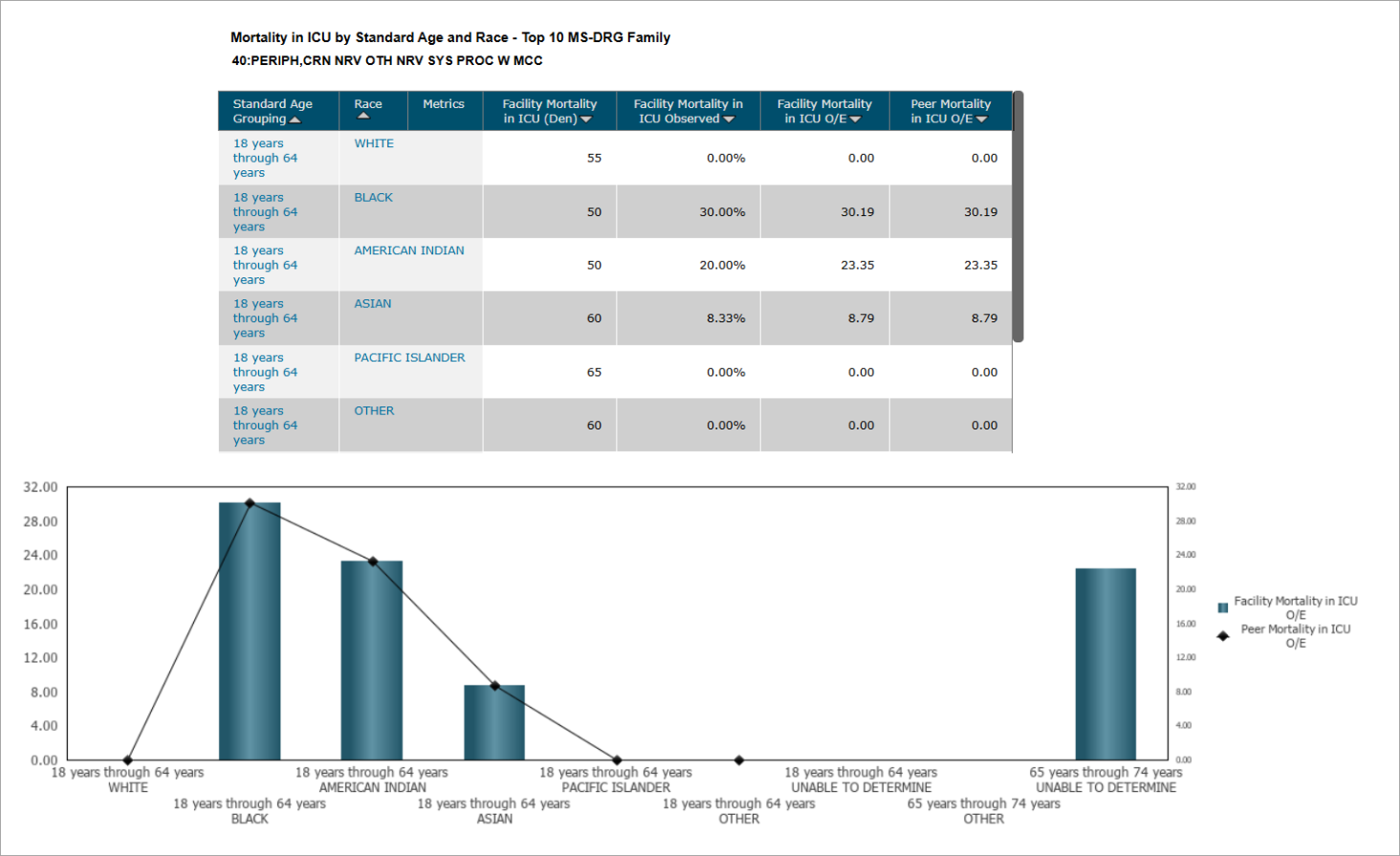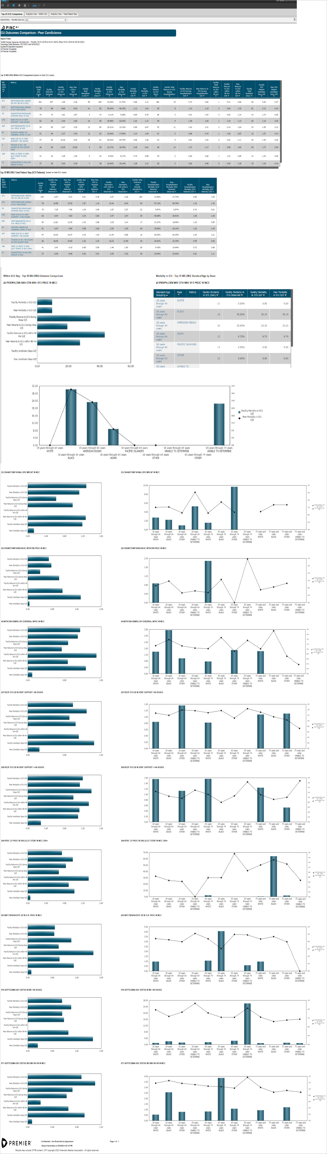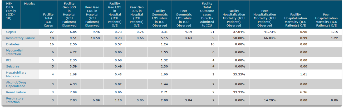 Shows the outcomes per MS-DRG Family for the Top 10 based on total ICU cases (facility and peer)