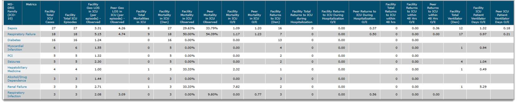 Includes a separate section that returns the Top 10 MS-DRG Family that is looking at your ICU patients full hospital stay. These metrics are calculated at the patient level