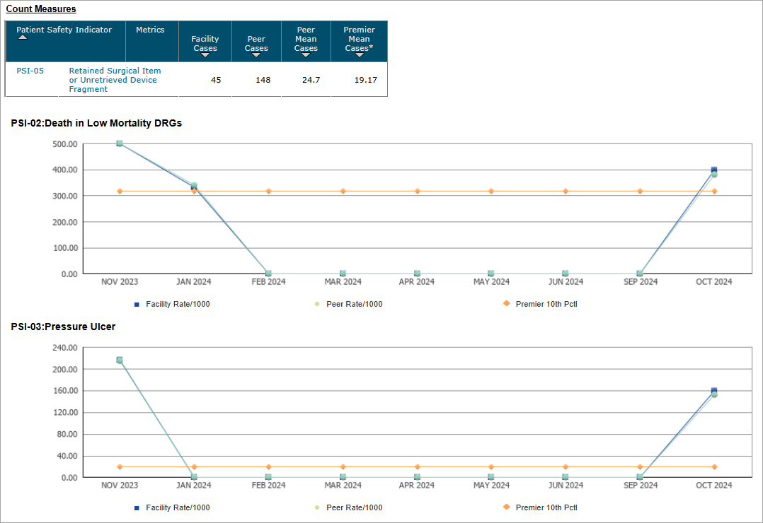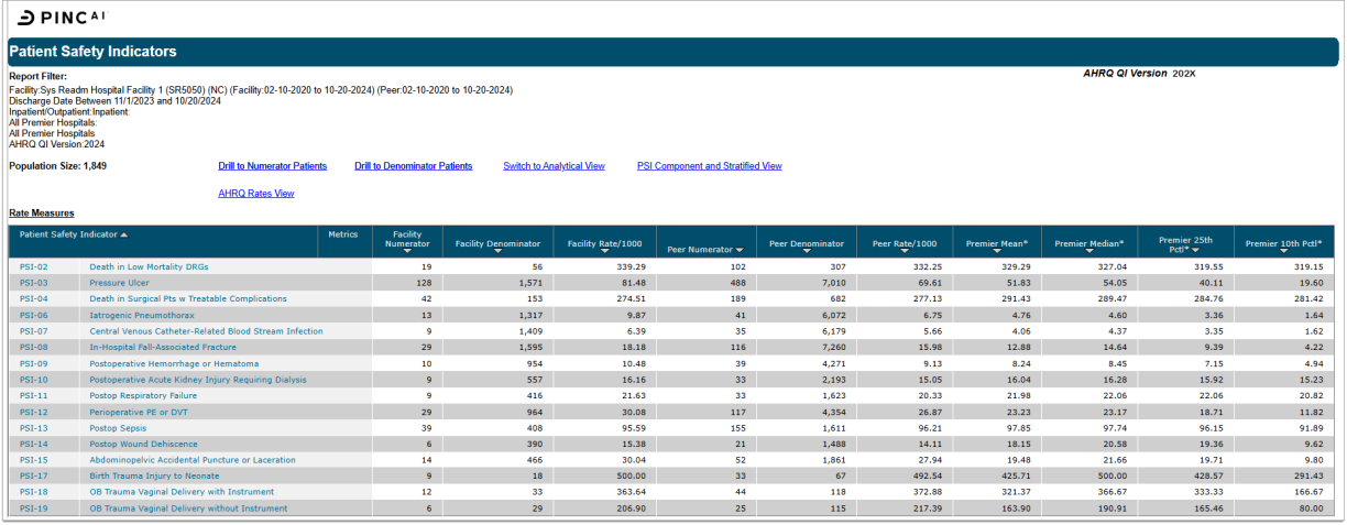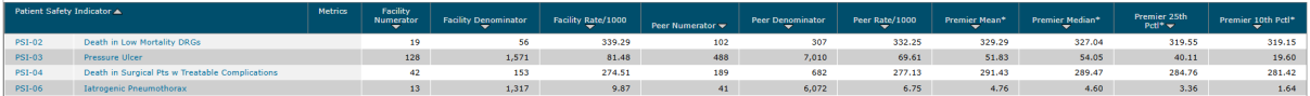 Displays AHRQ Expected, Risk-adjusted, and Smoothed Rates for most all PSIs for both the facility and the peer. AHRQ rates expand your comparative options beyond the raw Premier Population Statistics comparative columns (Premier Mean, Median, 25th Percentile and 10th Percentile) included on the main report.