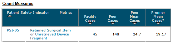 AHRQ PSI-05 is a count indicator, not a rate measure; AHRQ does not define a denominator for this PSI. The total count for this indicator is displayed in the Observed Numerator column.